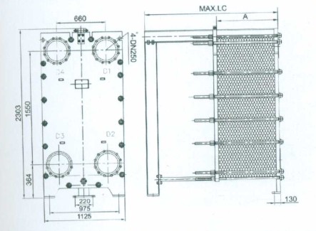 板式換熱器是由固定擋板、板片、移動(dòng)擋板、立柱、上導(dǎo)軌、下導(dǎo)軌及固定螺栓組成。在固定擋板及移動(dòng)擋板之間是一系列被固定的板片。每片板片均有墊圈,所以板片間構(gòu)成相互平行的封閉流道,介質(zhì)在每?jī)蓧K板片之間交替流動(dòng)。